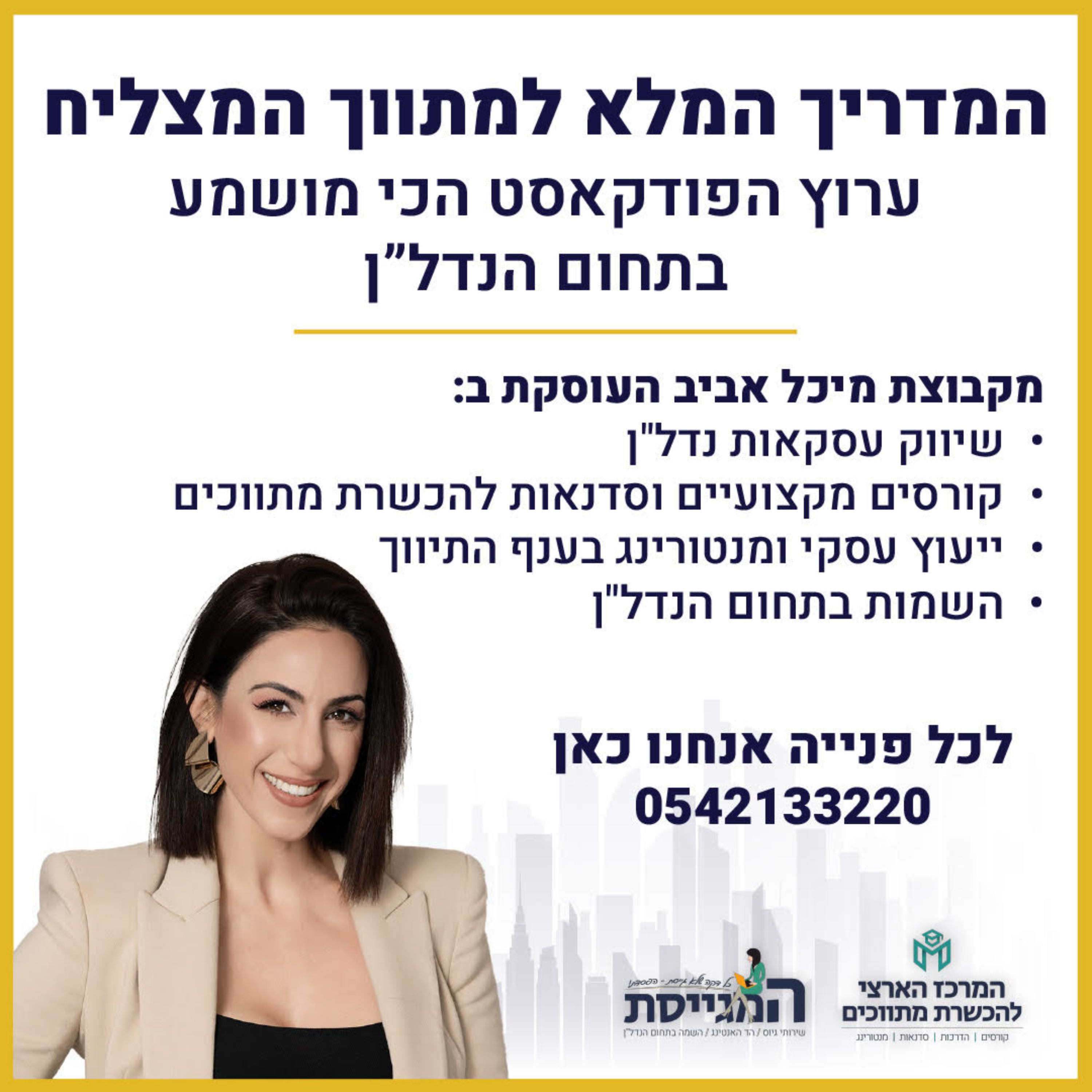 מיכל אביב- אשת עסקים ויזמית, בפודקאסט מקצועי ומעורר השראה על נדל״ן, יזמות, עולם התיווך והקשר הטבעי שביניהם. מה הופך יזם ליזם מצליח?מה הופך מתווך למתווך מצליח? בפודקאסט נלמד לעומק כיצד עולם התיווך ועולם היזמות משלימים אחד את השני ויכולים, בעבודה חכמה ומדוייקת- להעביר אתכם מהכסף הקטן לכסף הגדול. בפודקאסט ניתן כלים פרקטיים ויקרי ערך, טקטיקות ותוכניות פעולה לפיתוח עסקי והגדלת רווחים. בפודקאסט מתארחים מידי שבוע אנשי הנדל״ן הגדולים והמובילים, לראיונות מקצועיים ומעוררי השראה בהם הם פורסים את משנתם ומשתפים אתכם בעצות והסודות איך לעשות את זה גם. וכן- נעסוק גם בהתפתחות אישית וחוסן מנטלי שיעזרו לנו להיות אנשי עסקים טובים יותר.